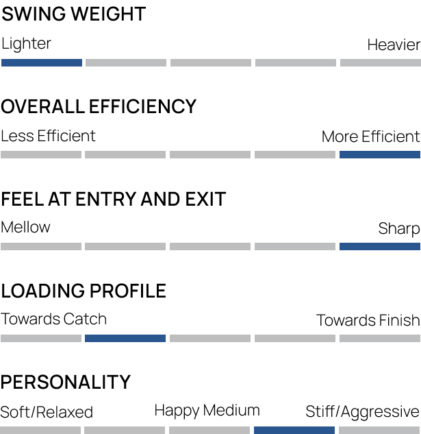 The Comp is a short, wide blade that is very stable on the drive which contributes to confidence when applying power and overall comfort. “Weight in the hand” or “swing weight” is lighter than oars with larger blades, saving energy and facilitating higher stroke rates.