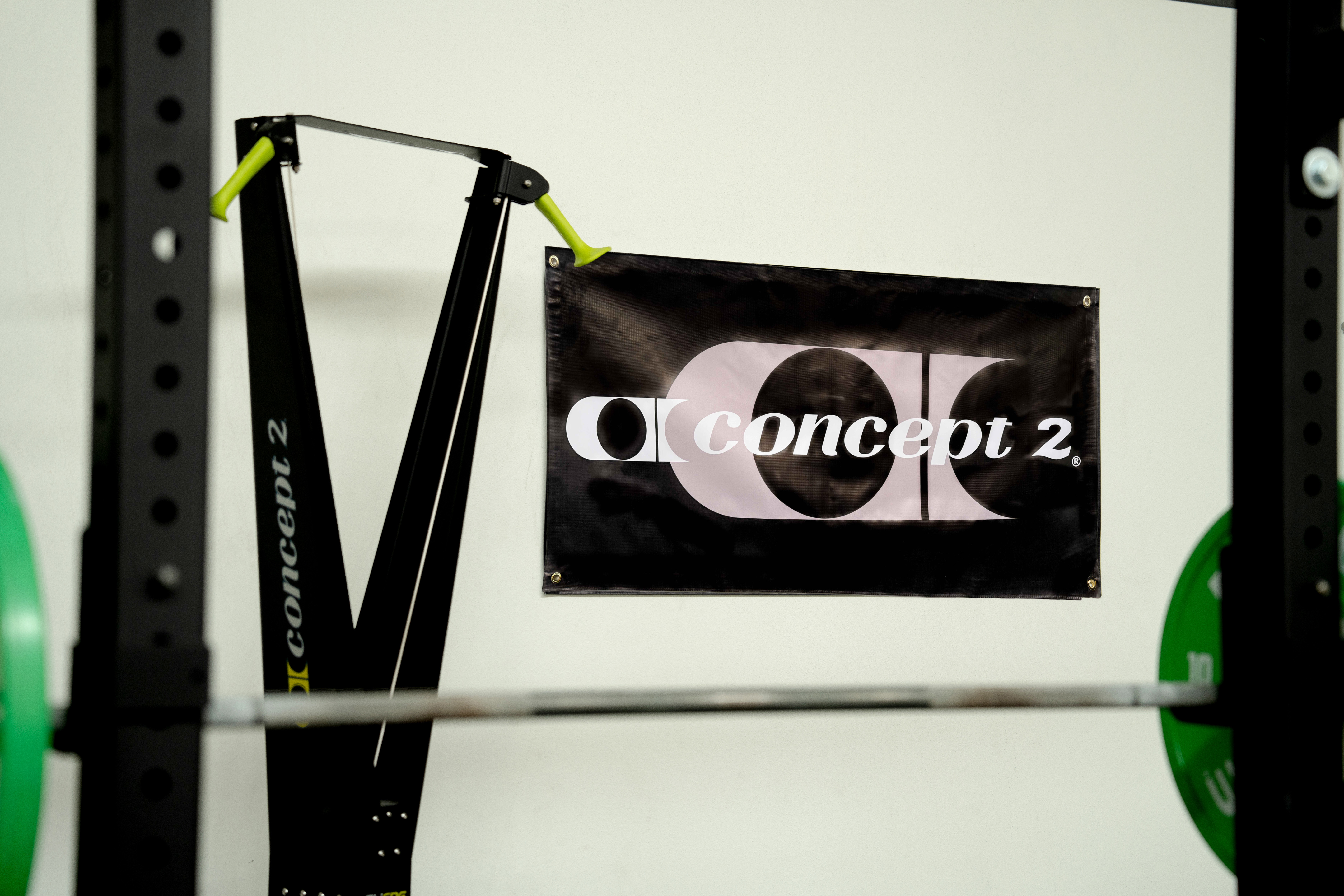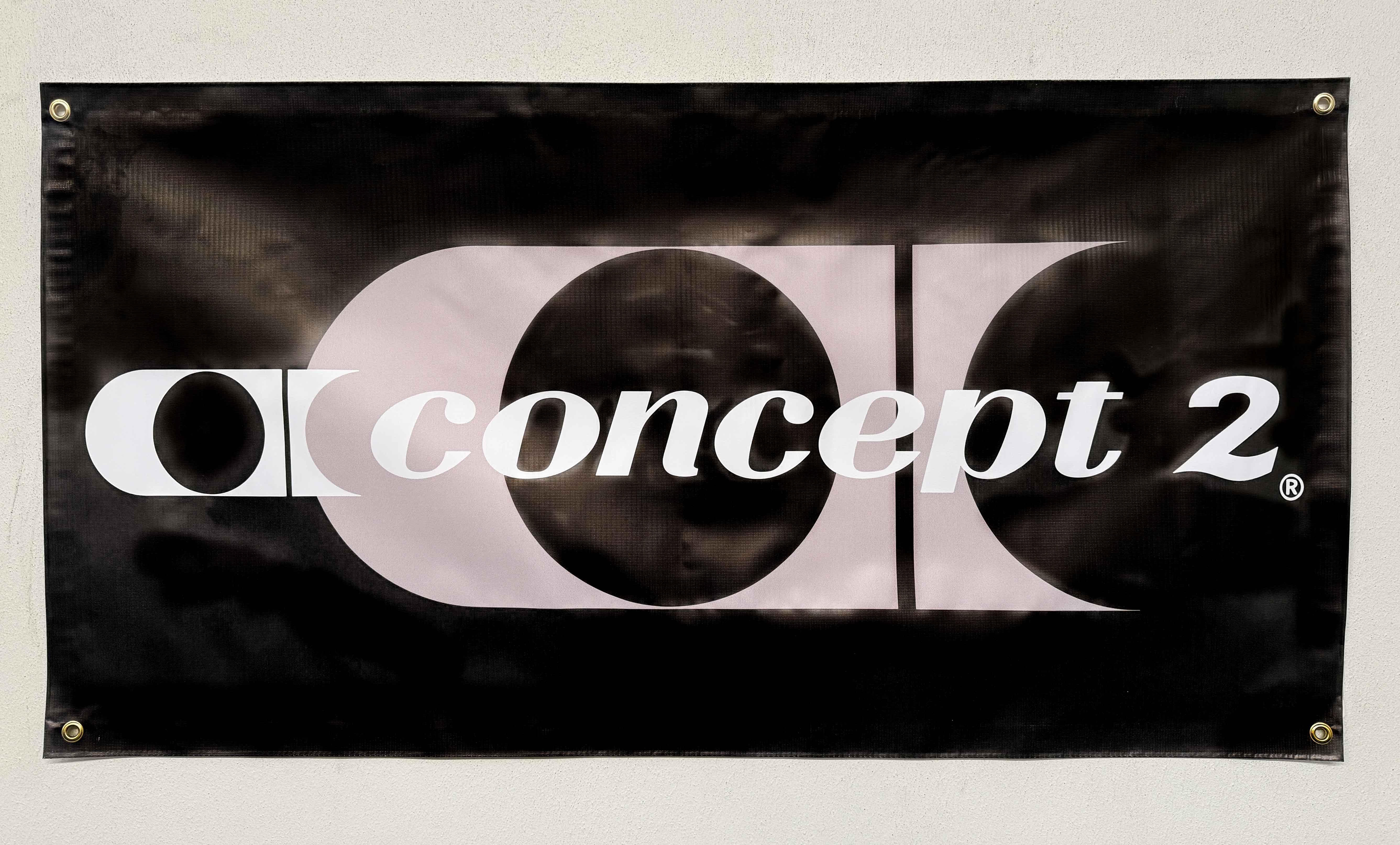 Rep your favorite fitness brand wherever you train with our 60cm x 120cm vinyl Concept2 Logo banner! Black background featuring "Concept2" in white lettering over vintage "C2" logo in gray.